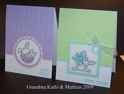 Here are the cards Mathias and I made yesterday using Bunny Love, a cute new set from the spring Close To My Heart catalog. As you can see, we used the same sketch for all four cards. Three-year-olds like to keep moving, and thus, coming up with a variety of sketches was out of the question.Once I got it measured, Mathias did all of the paper cutting. He also operated the 'cranker thing' AKA Cuttlebug with the embossing folders and Nestabilities dies. He was happy to watch me do the stamping and coloring, which I did with Prismacolor pencils and odorless mineral spirits. He was even impressed, stating quite emphatically, "You're a good colorer, Gamma!" Throughout the process, he offered color suggestions with me accepting enough of them for him to feel good about what we were doing. He learned to use the tape runner and poke holes with the 'stabber thing' AKA piercing tool, which I made clear is for is only for 'stabbing' paper! We talked about shapes, texture, and color, and I answered what